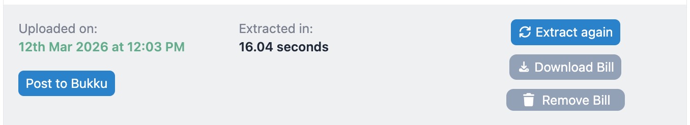 At the bottom of the bill there 4 action buttons; Post to Bukku, Extract again, Download bill and Remove bill. "Post to Bukku" will on post this single bill to Bukku.