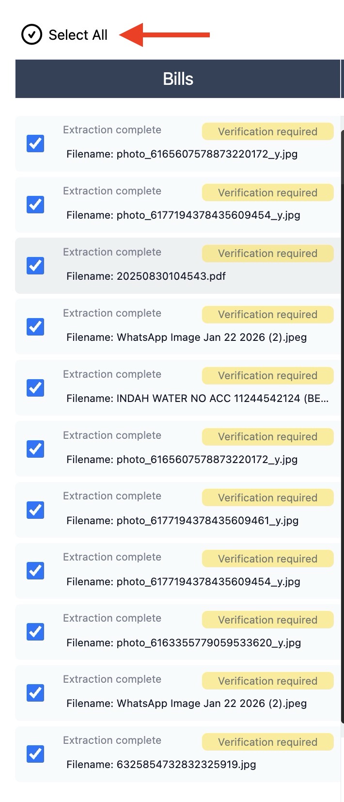 Bills that has completed AI extraction and requires human (you) verification will be labeled as “Verification required”